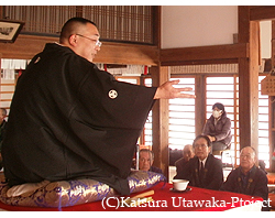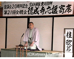 ここは被災した市民の避難所です。6月に訪れましたが、ちょうど仮設住宅への入居が開始された頃でもあり、この日も引っ越し準備に追われる被災者の方が幾人もおられました。一時期は数百人が肩を寄せ合うように暮らし、ぎすぎすした雰囲気になったこともあったそうですが、伺った当日は数十人までに数を減らしており、閑散とした園内に流れる空気もゆったりとしたものでした。しかし、このときは水道がまだ復旧しておらず、トイレも屋外へ設けられた仮設トイレの使用を余儀なくされるなど、不自由な生活を強いられる被災生活の厳しさも感じさせられました。私の演じている場所も実は被災者の方の生活空間でして、落語をおしゃべりするために間借りさせていただきました。